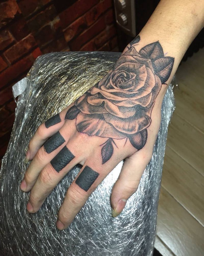 手背玫瑰➕手指纹身图片_手部欧美写实玫瑰手指纹身图案