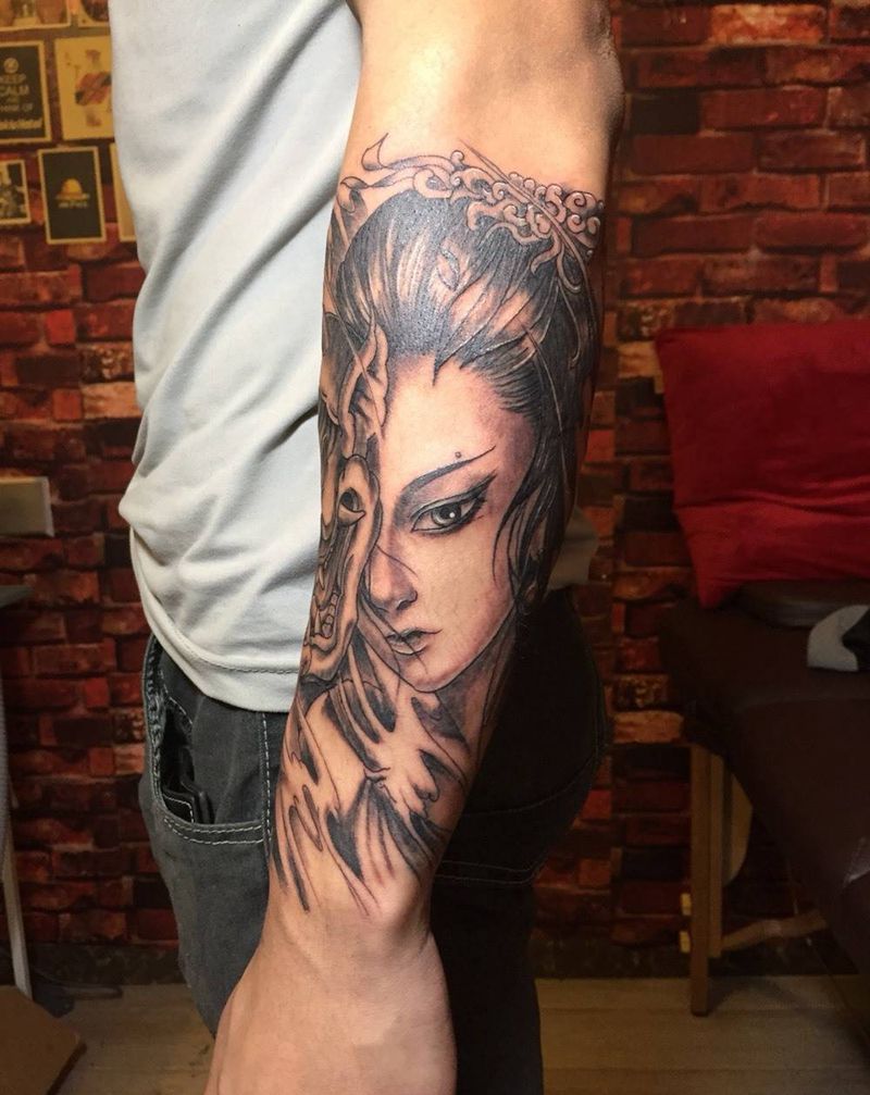 小臂艺伎纹身图片_手臂新传统艺伎般若纹身图案