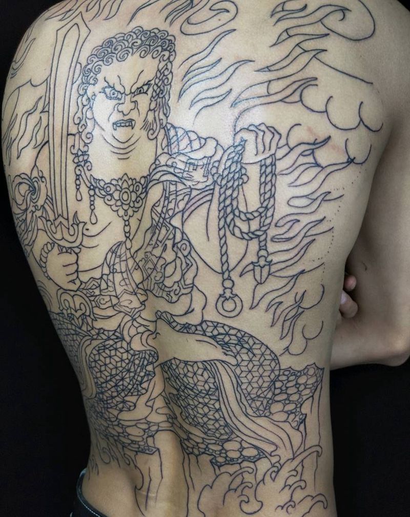 不动尊满背线条纹身图片_背部新传统不动明王线条纹身图案