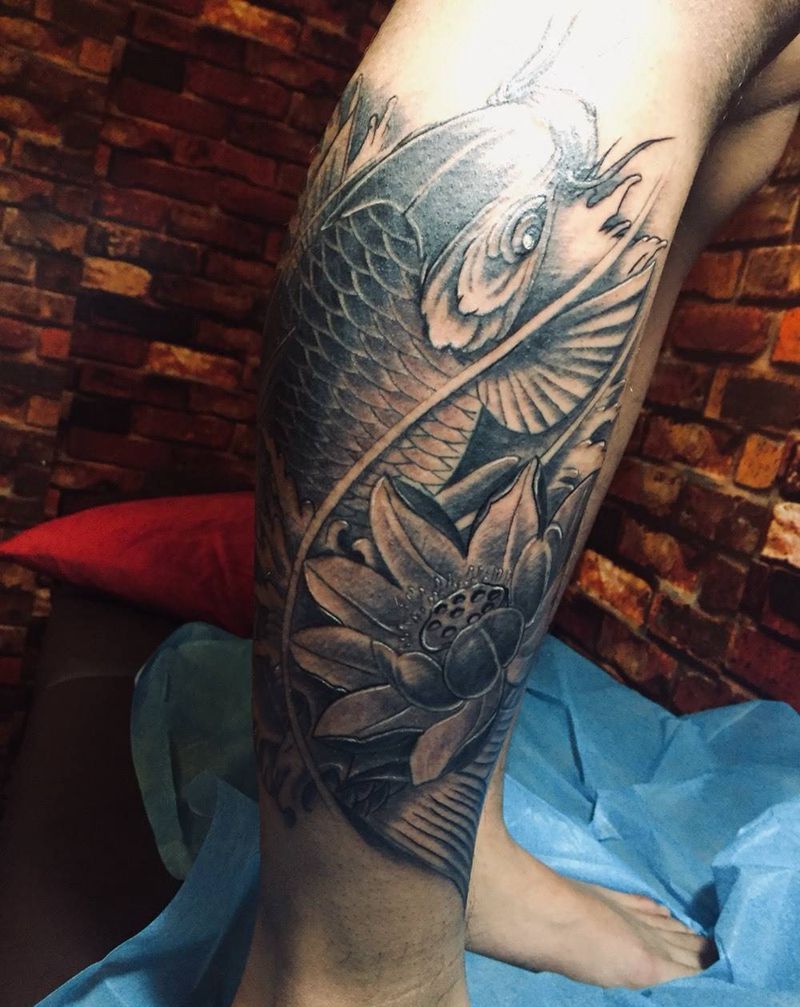 当前位置: 首页 >广东省广州市纹身店-纯针刺青工作室纹身图案>小腿鲤鱼纹身图片_腿部新传统鲤鱼荷花纹身图案