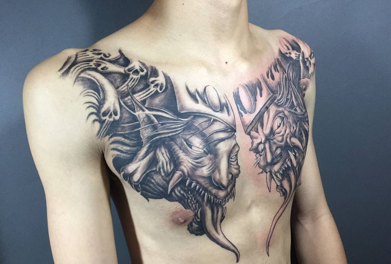 黑白无常花胸纹身图片_胸部新传统黑白无常花胸帅哥纹身图案