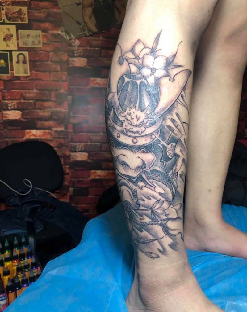 今工,小腿般若鬼武士纹身图片_腿部新传统般若鬼武士精雕刺青纹身图案