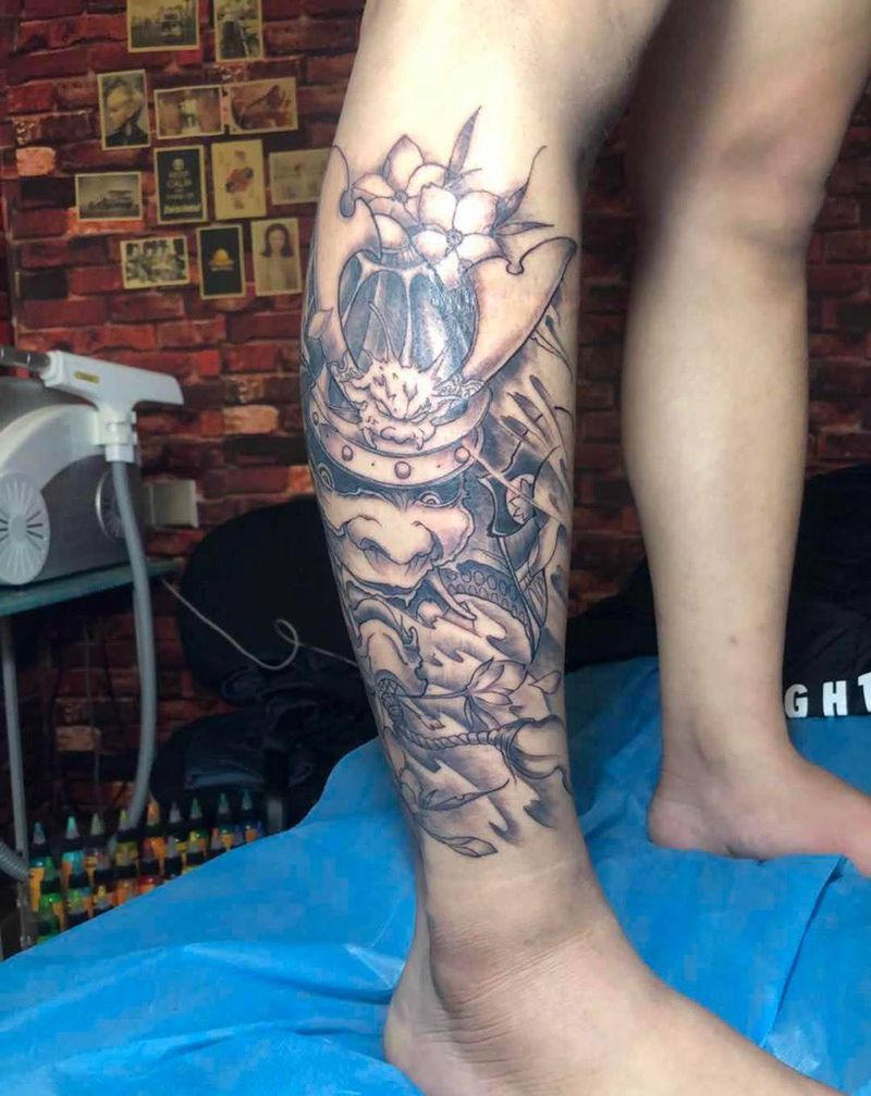 今工,小腿般若鬼武士纹身图片_腿部新传统般若鬼武士精雕刺青纹身图案