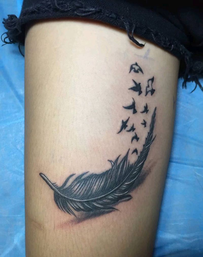 羽毛纹身图片_腿部欧美写实羽毛纹身图案