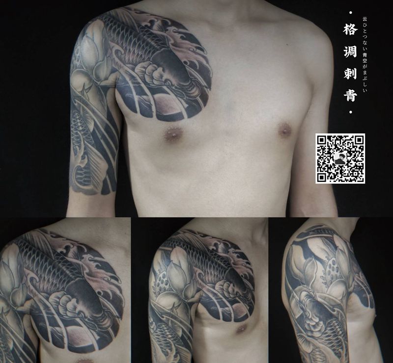 鲤鱼半甲纹身图片_手臂胸部新传统半甲鲤鱼纹身图案