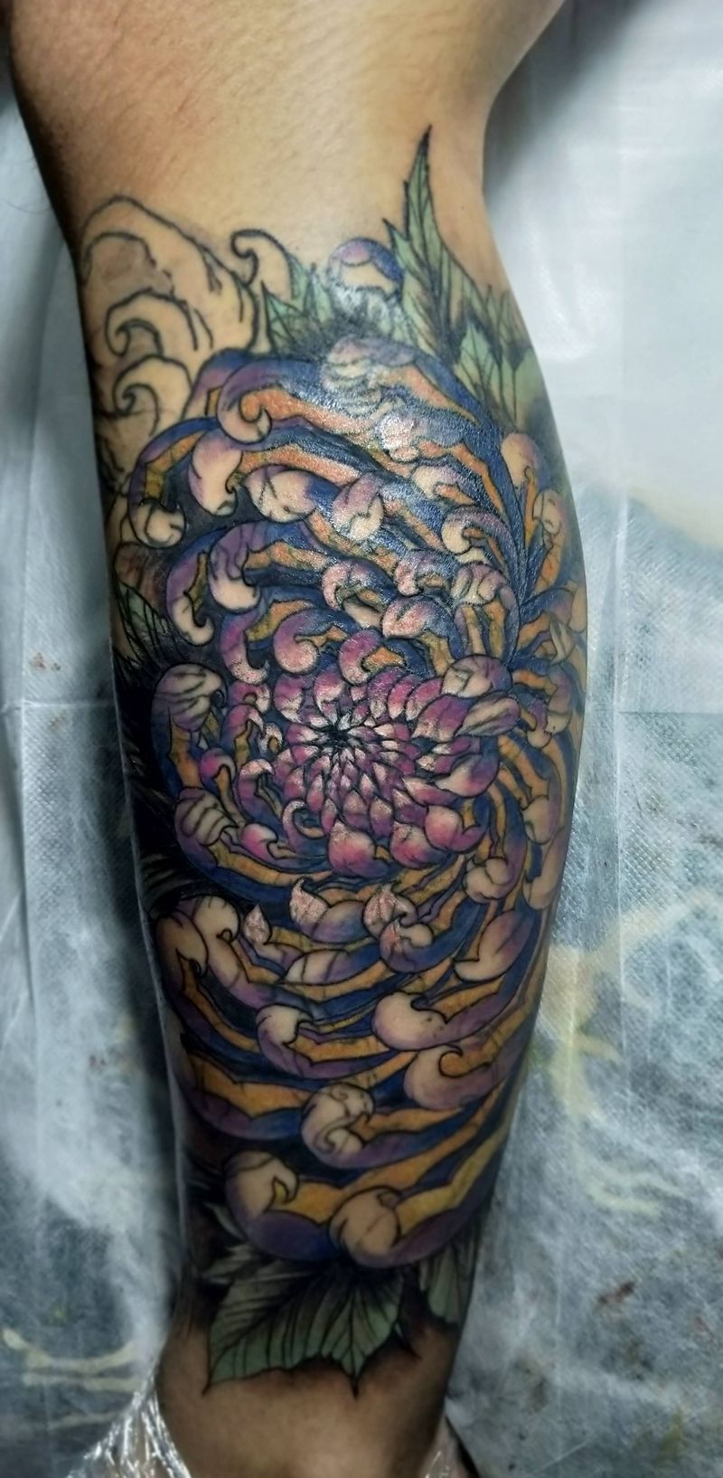 遮盖包小腿纹身图片_腿部新传统遮盖般若菊花纹身图案