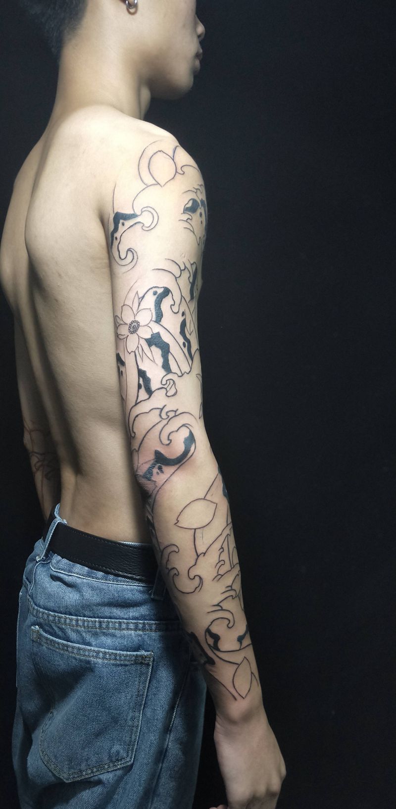当前位置: 首页 >广东省广州市纹身店-纯针刺青工作室纹身图案>日式花臂定线纹身图片_手臂老传统线条日式浪臂纹身图案