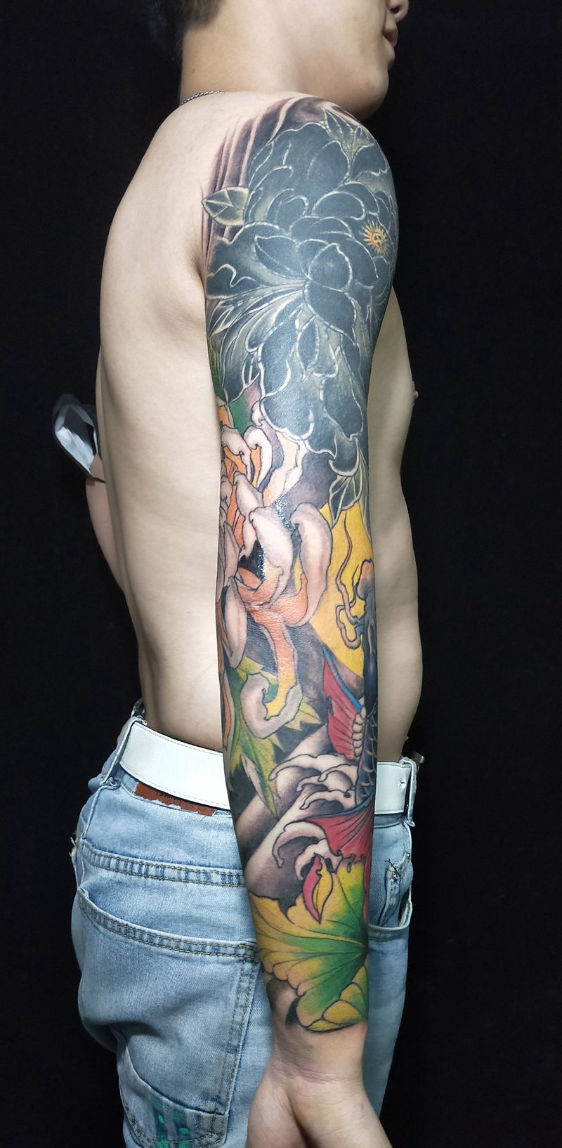 当前位置: 首页 >广东省广州市纹身店-纯针刺青工作室纹身图案>彩色包花臂纹身图片_手臂新传统鱼菊花牡丹纹身图案