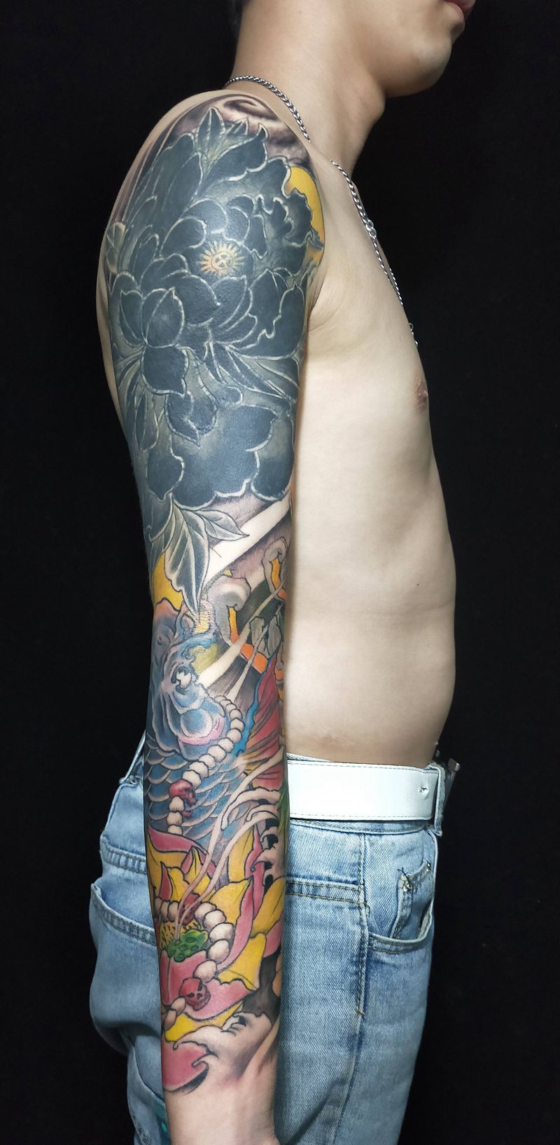 当前位置: 首页 >广东省广州市纹身店-纯针刺青工作室纹身图案>彩色包花臂纹身图片_手臂新传统鱼菊花牡丹纹身图案