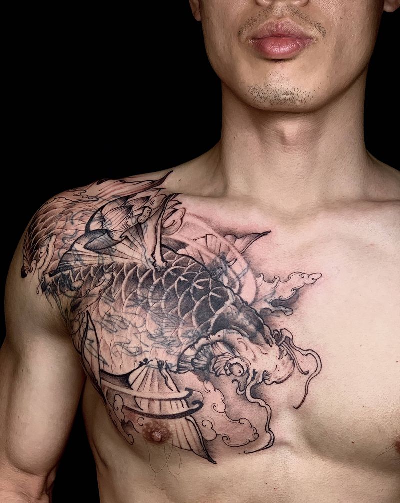 鲤鱼遮盖未完成待上色纹身图片_胸部新传统纹身图案