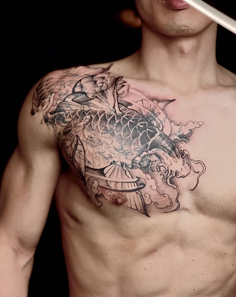 当前位置: 首页 >广东省广州市纹身店-番禺纹画社纹身图案>鲤鱼遮盖旧纹身纹身图片_胸部新传统纹身图案