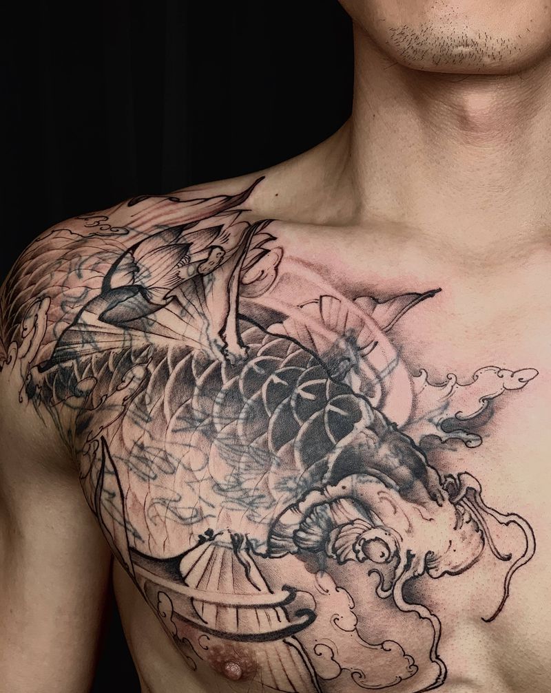鲤鱼遮盖旧纹身纹身图片_胸部新传统纹身图案