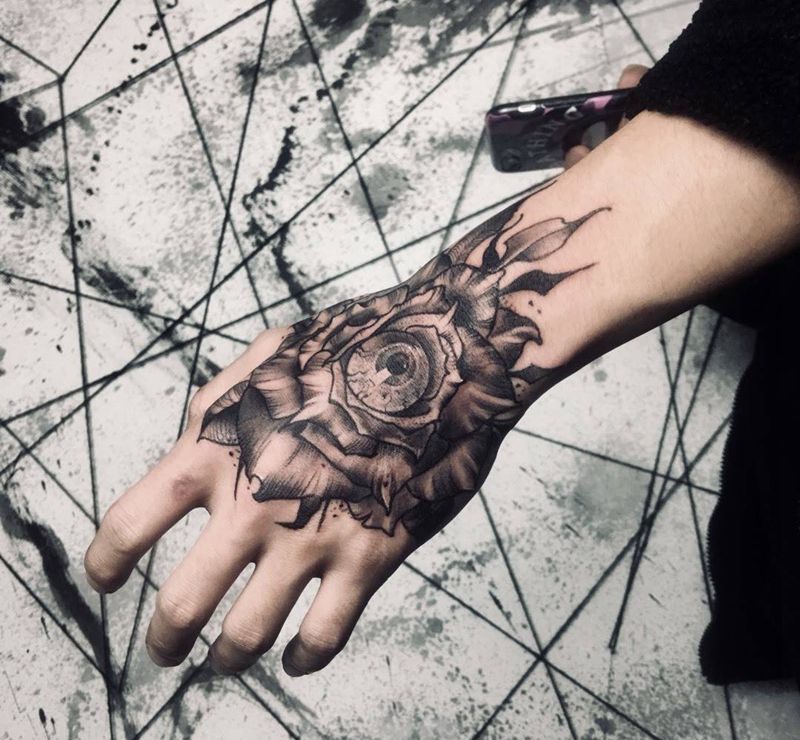 • 手背潮流时尚的玫瑰花眼睛纹身图案