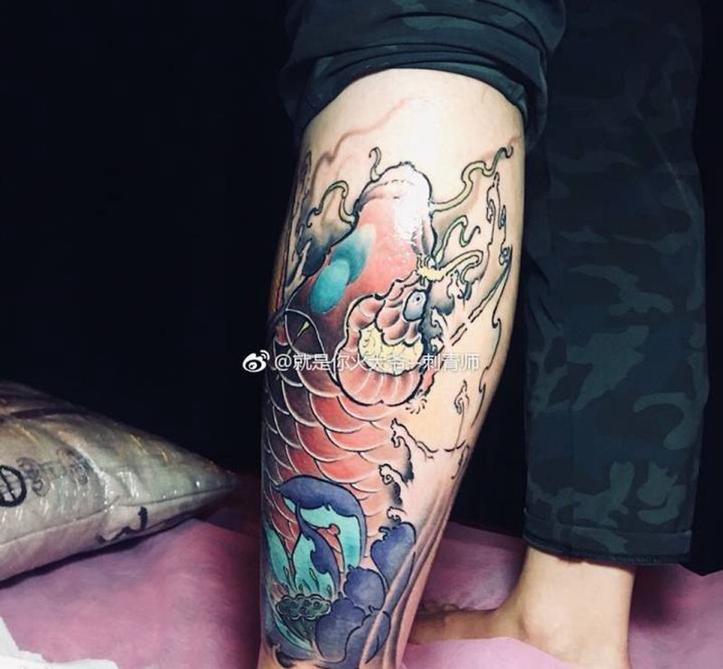 当前位置: 首页 >广东省广州市纹身店-番禺纹画社纹身图案>模特鲤鱼纹身图片_成品腿部传统动物纹身图案