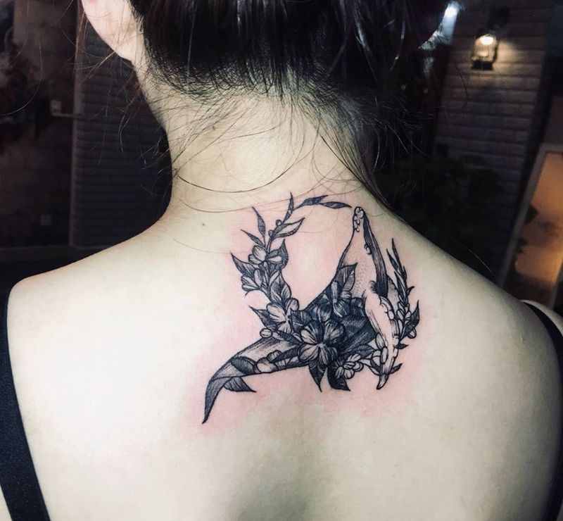 鲸鱼遮盖旧纹身纹身图片_背部素花遮盖纹身图案