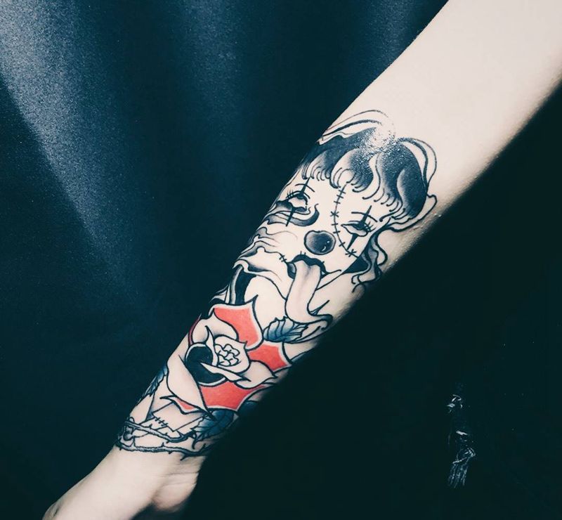 • T包小腿吹火男+阿多福纹身图片_腿部老传统新传统吹火男阿