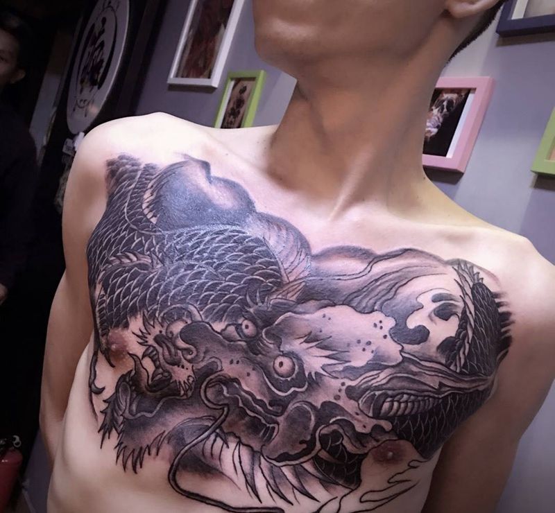 花胸盘龙纹身图片_覆盖胸部成品纹身图案