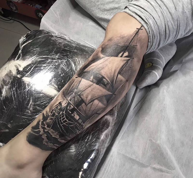 帆船 遮盖纹身图片_腿部欧美写实纹身图案