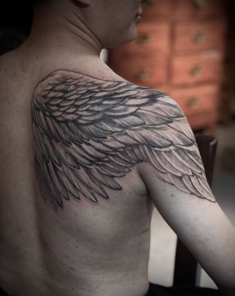 翅膀手绘纹身图片_背部欧美写实纹身图案