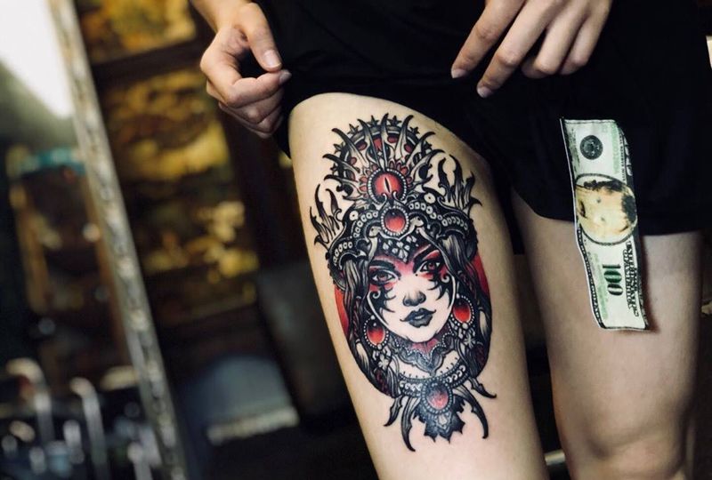 • T网红王老大花腿龙纹身图片_腿部新传统纹身图案
