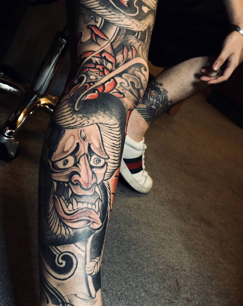 当前位置: 首页 >广东省广州市纹身店-東刺青纹身工作室纹身图案>融合纹身图片_腿部新传统New School纹身图案