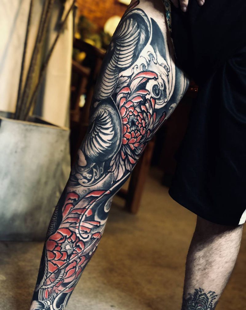 • T网红王老大花腿龙纹身图片_腿部新传统纹身图案
