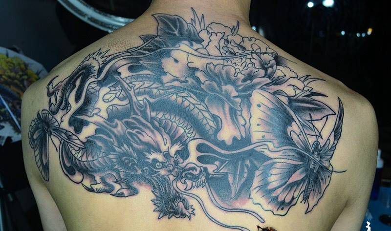 当前位置: 首页 >广东省广州市纹身店-墨刺青工作室纹身图案>龙蝴蝶牡丹花纹身图片