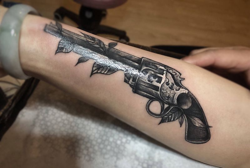当前位置: 首页 >广东省深圳市纹身店-初见刺青纹身图案>旧图遮盖枪纹身图片_手臂欧美写实纹身图案