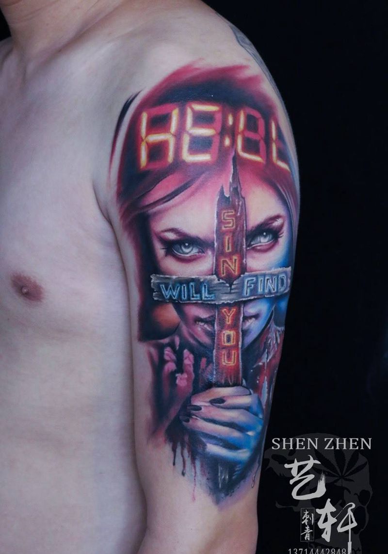 当前位置: 首页 >广东省深圳市纹身店-深圳南山艺轩纹身工作室纹身图案>欧美纹身图片_成品手臂欧美人物纹身图案