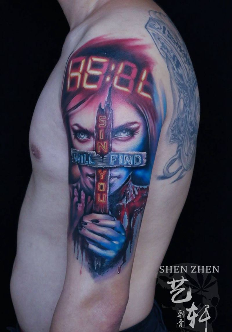 当前位置: 首页 >广东省深圳市纹身店-深圳南山艺轩纹身工作室纹身图案>欧美纹身图片_成品手臂欧美人物纹身图案