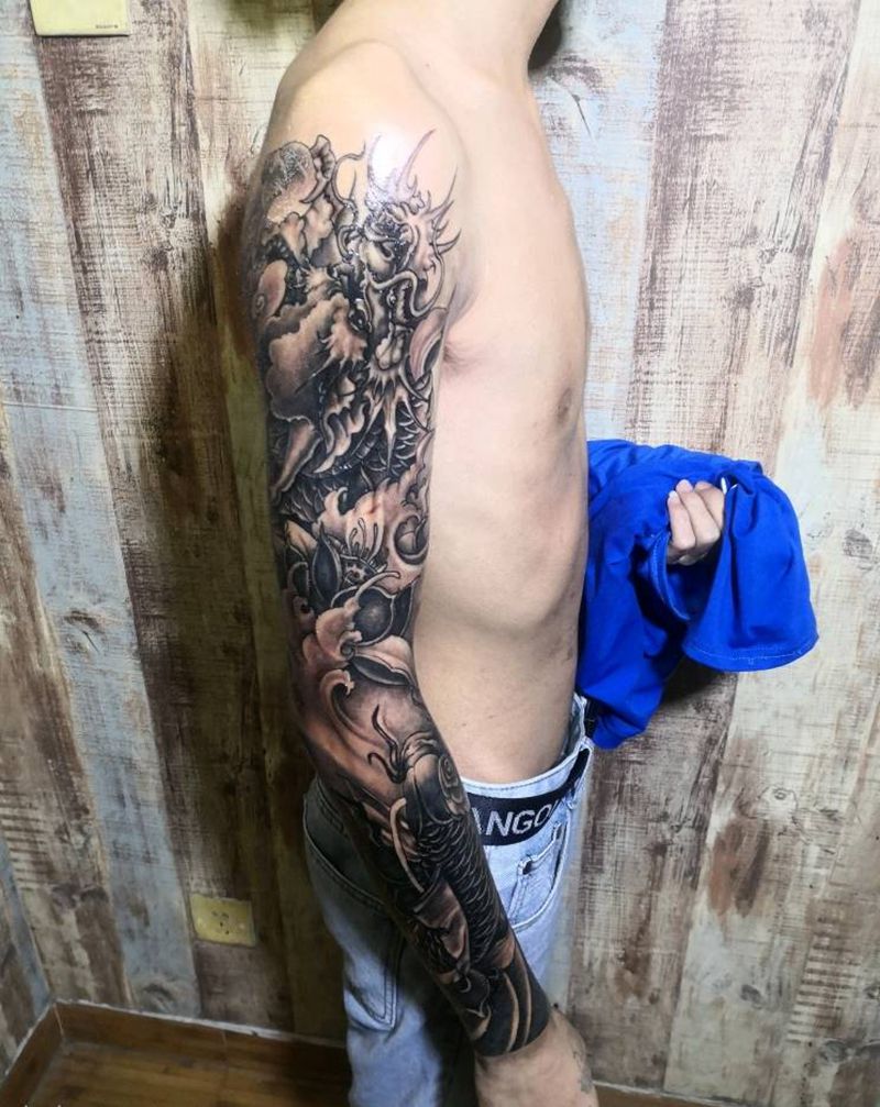当前位置: 首页 >广东省深圳市纹身店-水刺青纹身图案>龙和鲤鱼花臂纹身图片_手臂老传统纹身图案