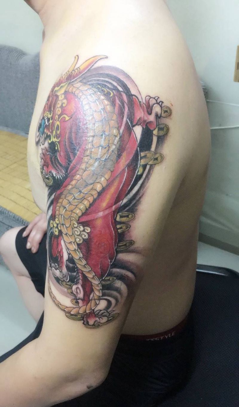 • T网红王老大花腿龙纹身图片_腿部新传统纹身图案