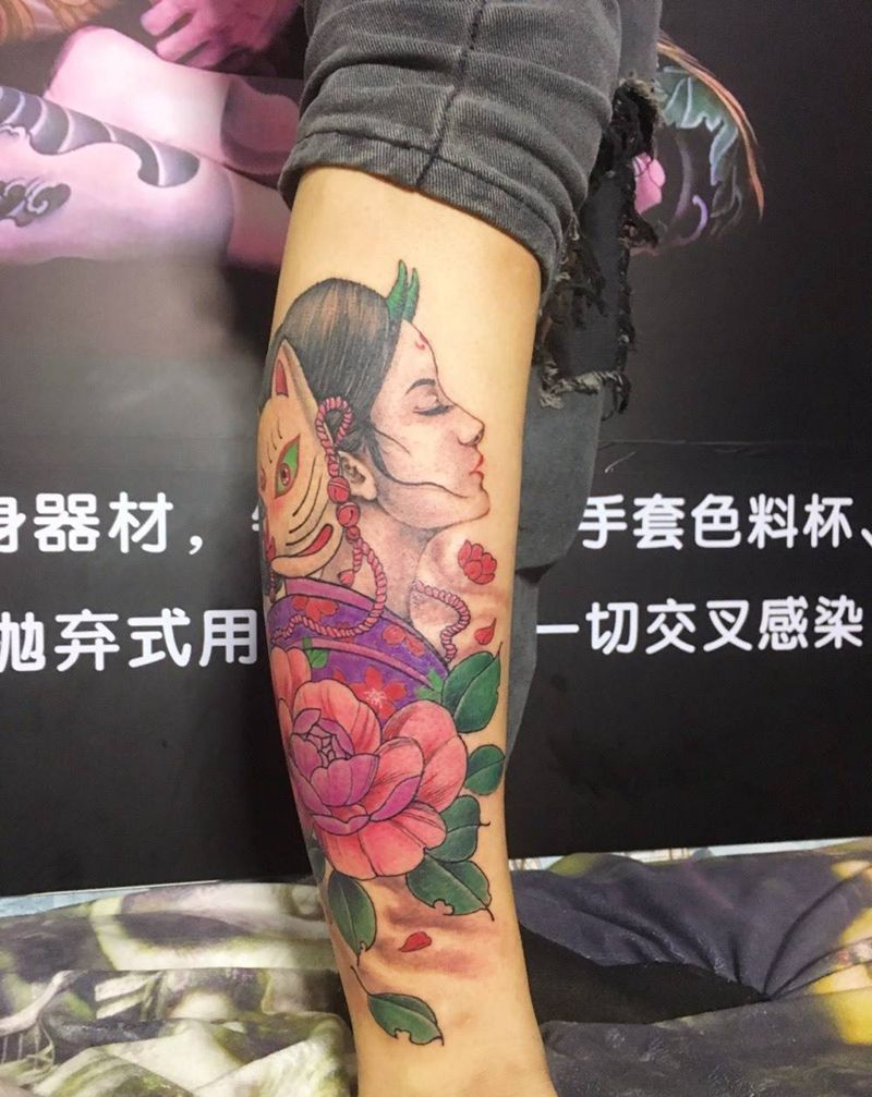 花姑娘纹身图片_腿部新传统纹身图案