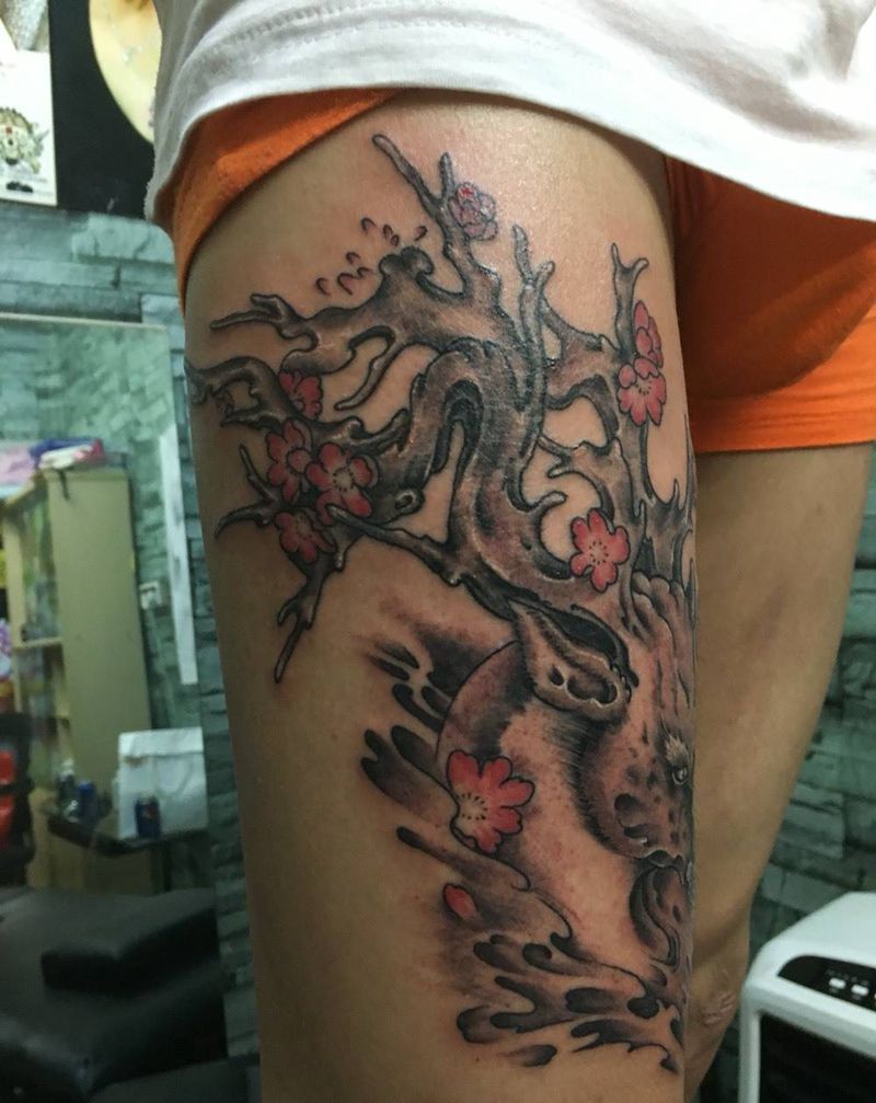 • T网红王老大花腿龙纹身图片_腿部新传统纹身图案