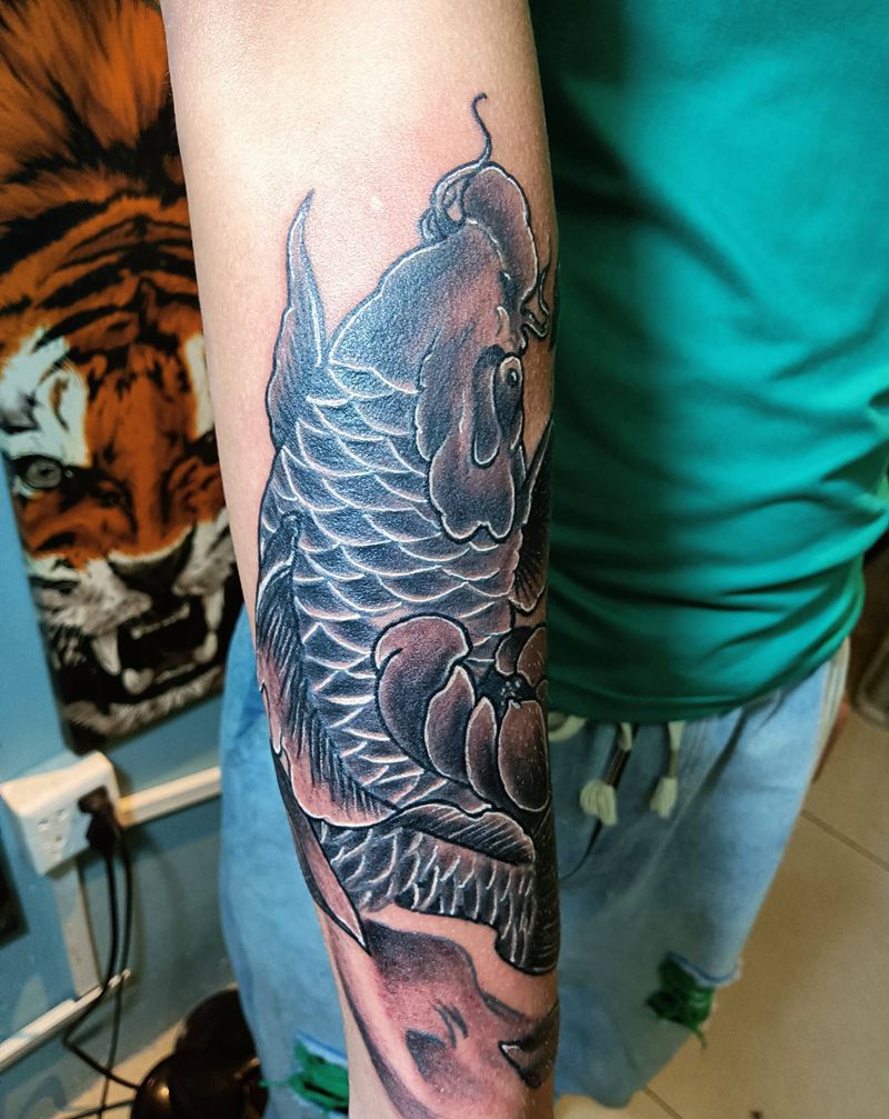 当前位置: 首页 >广东省深圳市纹身店-深圳-七道刺青社TATTOO STUDIO纹身图案>鲤鱼修改上色纹身图片_手臂手部新传统纹身图案