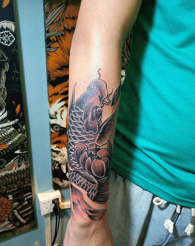 当前位置: 首页 >广东省深圳市纹身店-深圳-七道刺青社TATTOO STUDIO纹身图案>鲤鱼修改上色纹身图片_手臂手部新传统纹身图案