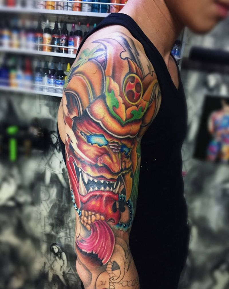当前位置: 首页 >广东省深圳市纹身店-深圳鬼舞刺青工作室纹身图案>花臂之鬼武士纹身图片