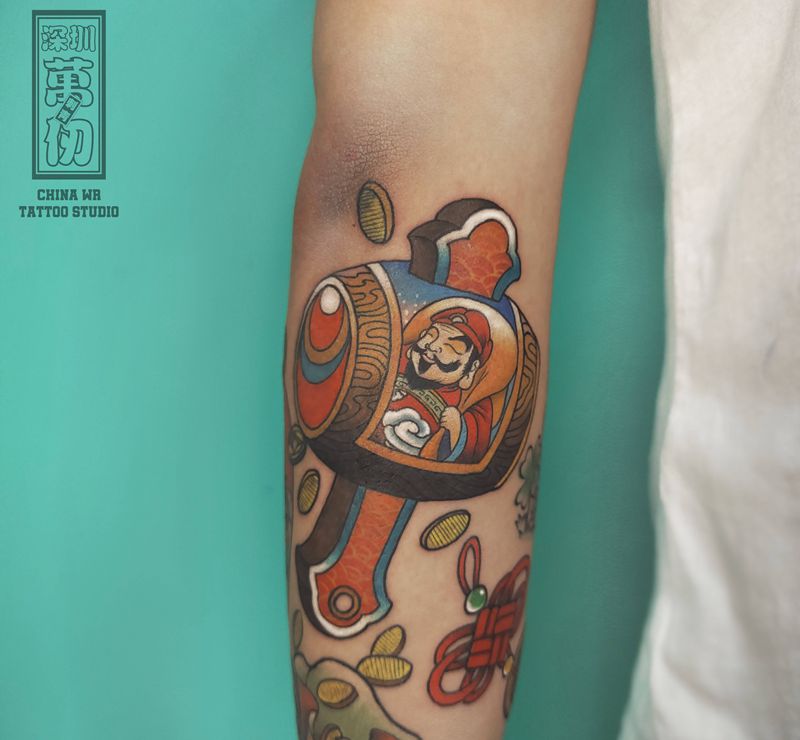 当前位置: 首页 >广东省深圳市纹身店-万仞刺青纹身图案>财神小福锤纹身图片_手臂手部新传统New School财神爷纹身图案