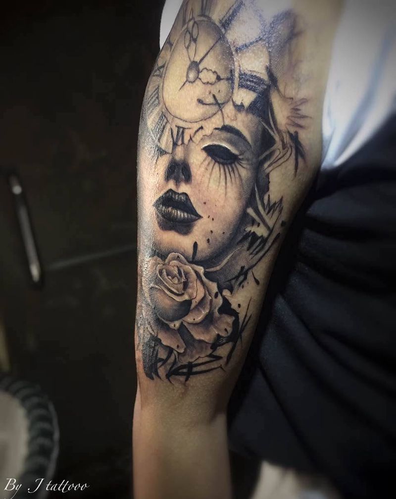 当前位置: 首页 >广东省深圳市纹身店-J Ma.Tattoo纹身图案>时光机纹身图片_欧美人物手臂写实肖像成品纹身图案