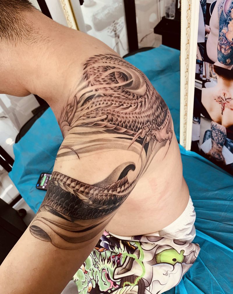 • T网红王老大花腿龙纹身图片_腿部新传统纹身图案