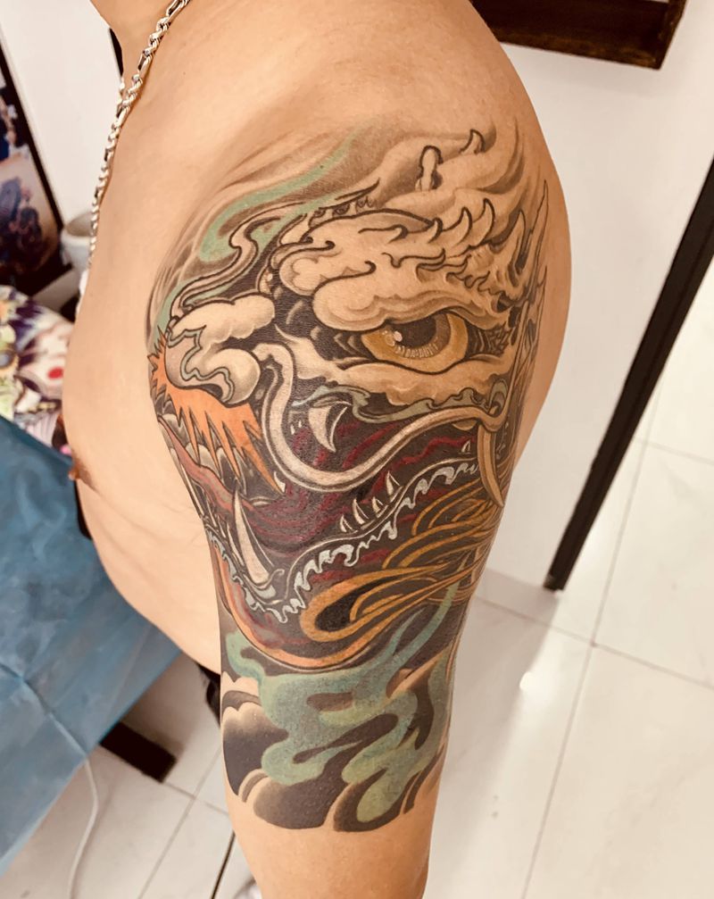 • T网红王老大花腿龙纹身图片_腿部新传统纹身图案