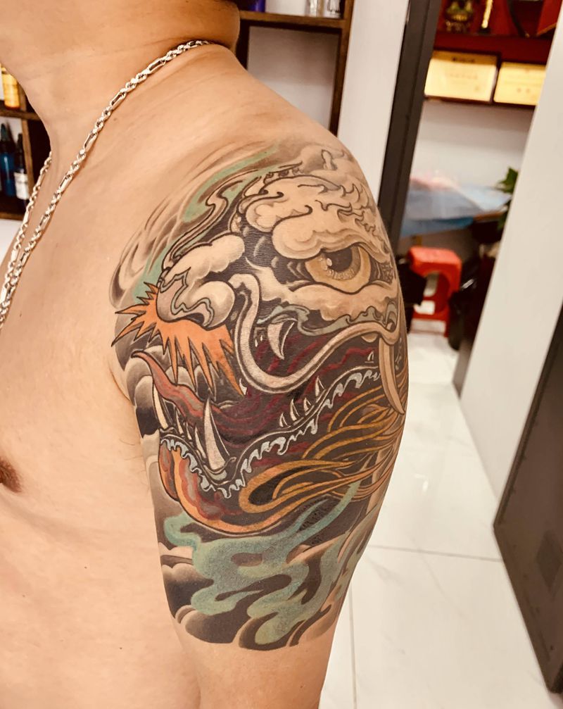 • T网红王老大花腿龙纹身图片_腿部新传统纹身图案