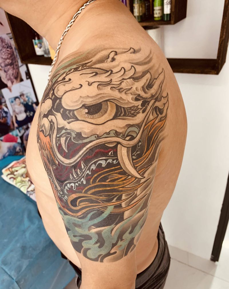 • T网红王老大花腿龙纹身图片_腿部新传统纹身图案
