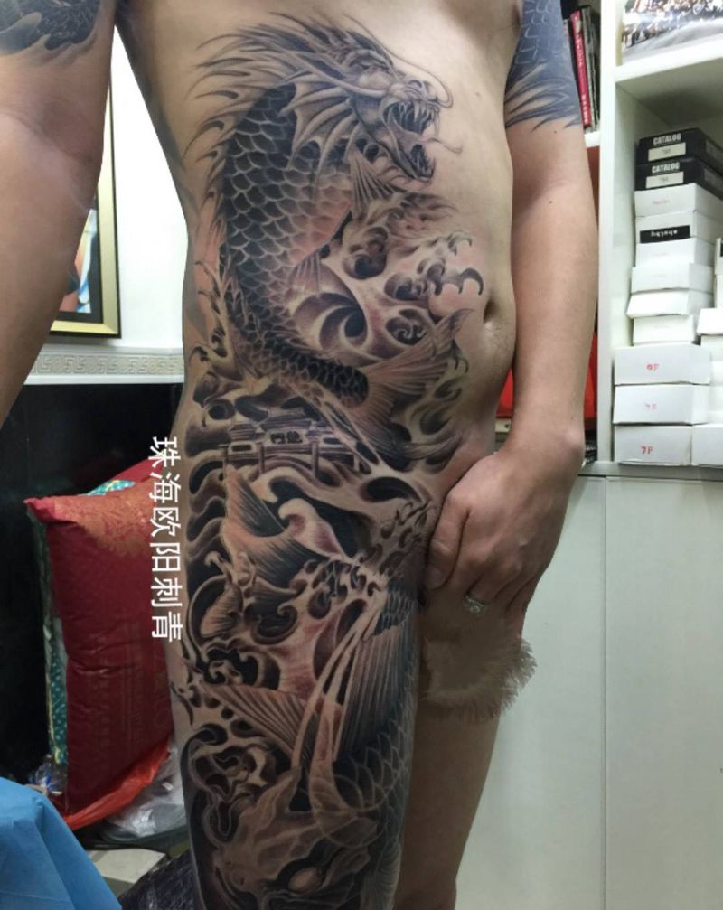 • T网红王老大花腿龙纹身图片_腿部新传统纹身图案