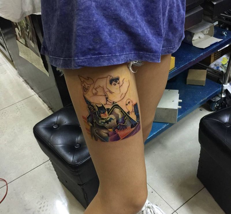 当前位置: 首页 >广东省珠海市纹身店-珠海欧阳刺青纹身图案>蝙蝠侠和超人纹身图片_欧美腿部人物纹身图案