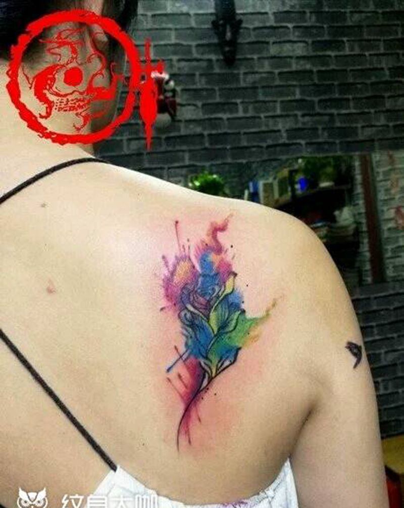 泼墨玫瑰+小鸟纹身图片_肩部背部清新动物植物成品纹身图案