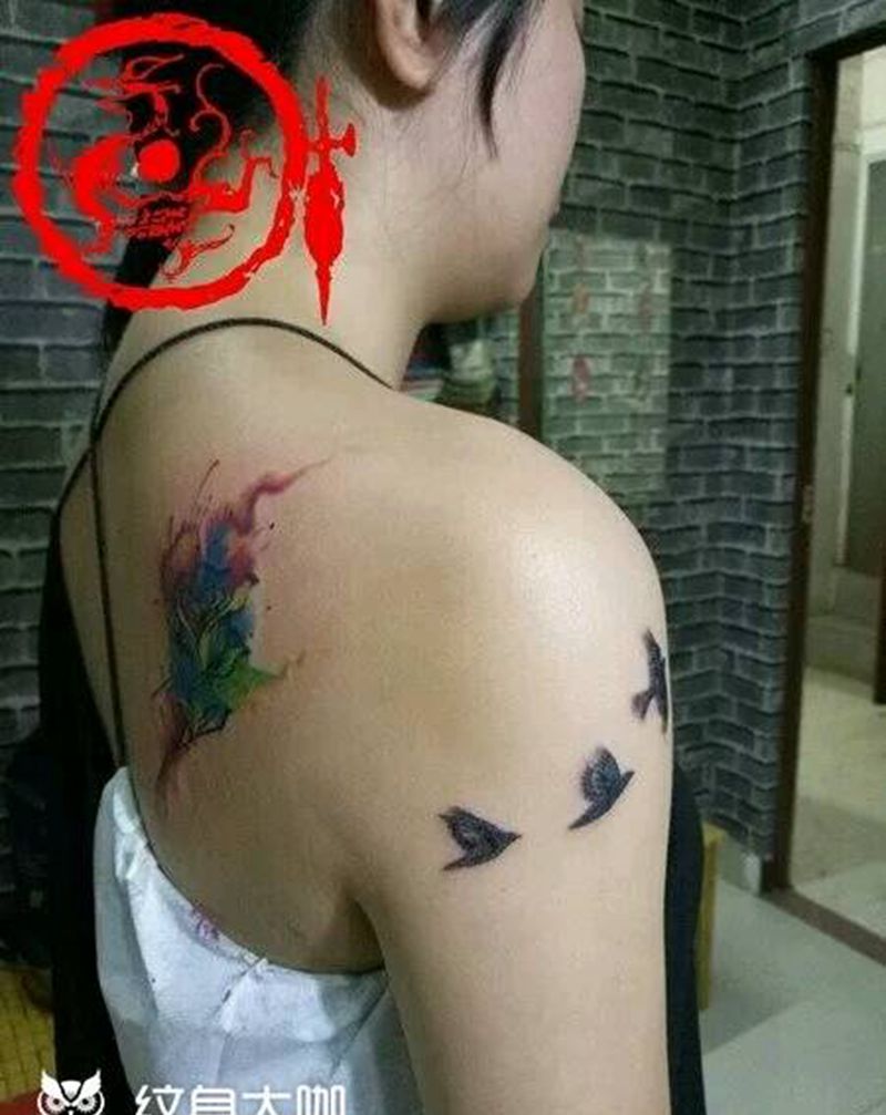 泼墨玫瑰+小鸟纹身图片_肩部背部清新动物植物成品纹身图案