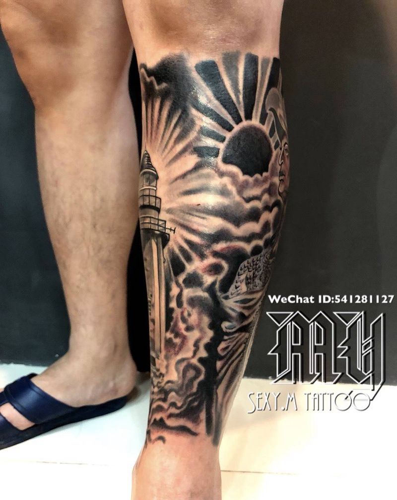 当前位置: 首页 >广东省珠海市纹身店-MY.sexy.m Tattoo纹身图案>寫實阿兹台克戰士燈塔包腿纹身图片_成品腿部写实纹身图案