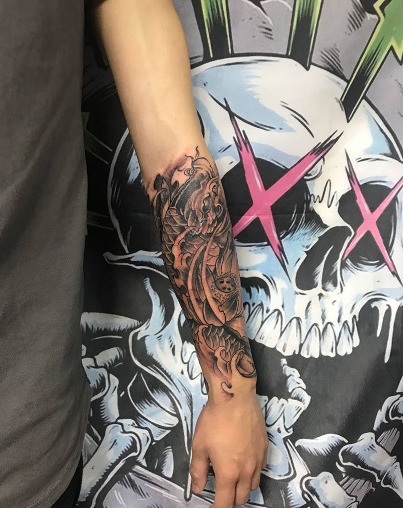 当前位置: 首页 >广东省汕头市纹身店-鬼墨刺青Tattoo纹身图案>鲤鱼遮盖大面积疤痕纹身图片