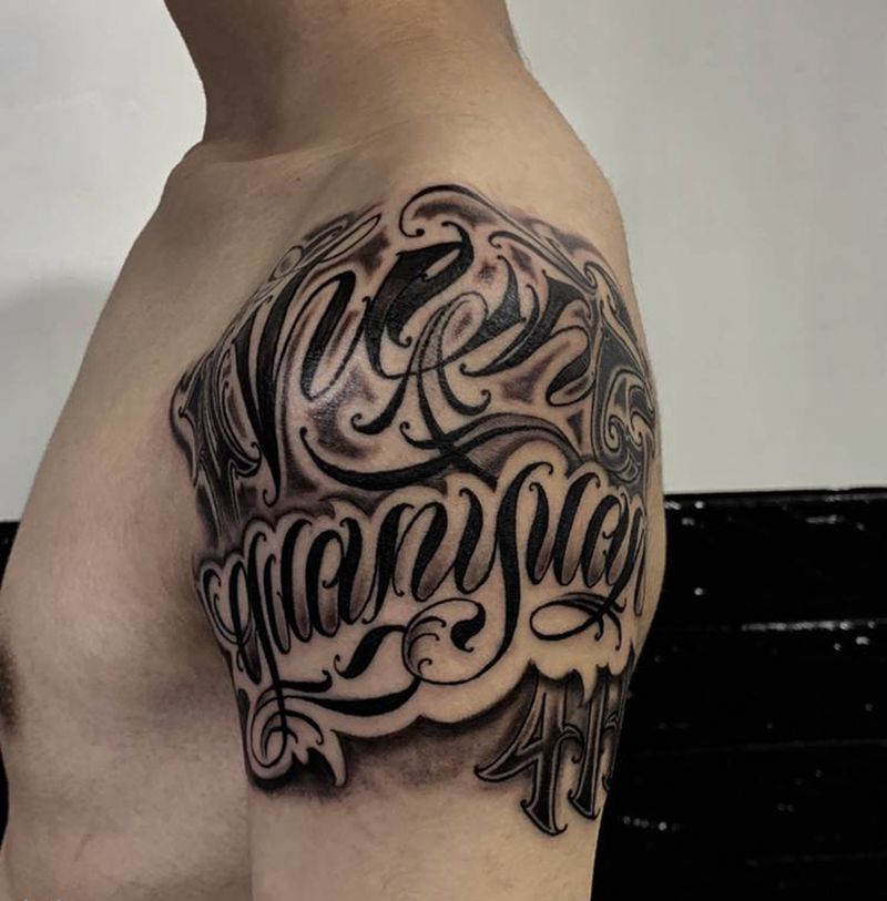 当前位置: 首页 >广东省珠海市纹身店-1973纹身图案>英文纹身图片_颈部手臂花体字点刺纹身图案